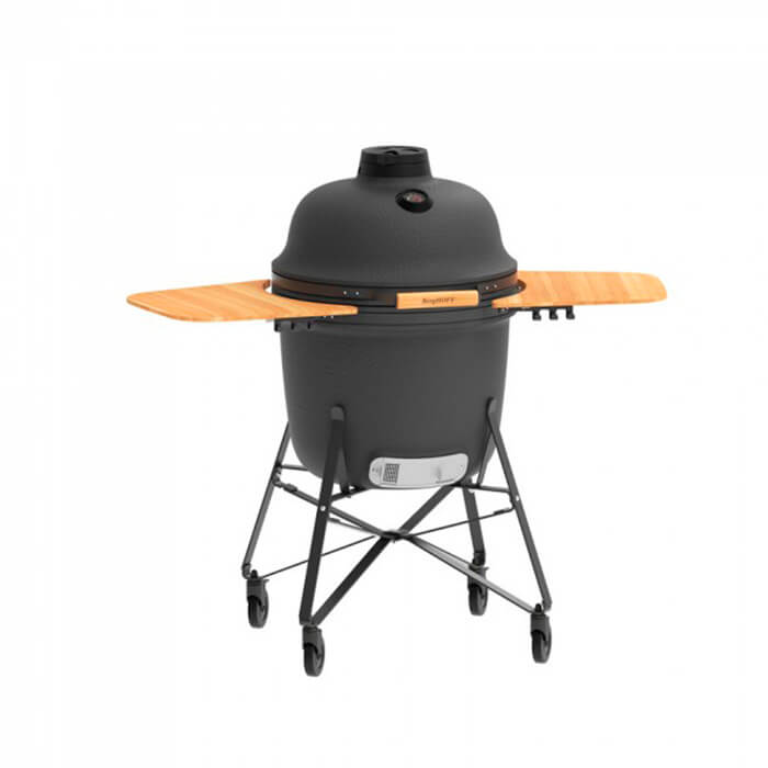 Особенности: возможно использование различных техник приготовления: жарка, выпекание, запекание, медленное томление, копчение, приготовление первых блюд; благодаря уникальной термостойкой керамике не страшны резкие перепады температуры; колпачок верхнего вентиляционного отверстия позволяет с точностью регулировать поступление воздуха; термометр контроля внутренней температуры для правильного процесса приготовления; для горения подходит древесный уголь или ароматическая древесина; подставка с колесами позволяет перемещать гриль в любое место