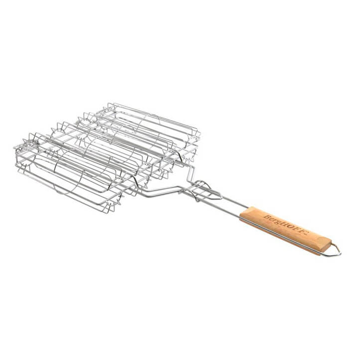 Решетка изготовлена из прочной стали. Предназначена для приготовления блюд на углях. Продукт плотно фиксируется верхней частью решетки, что позволяет равномерно обжарить его с обеих сторон.